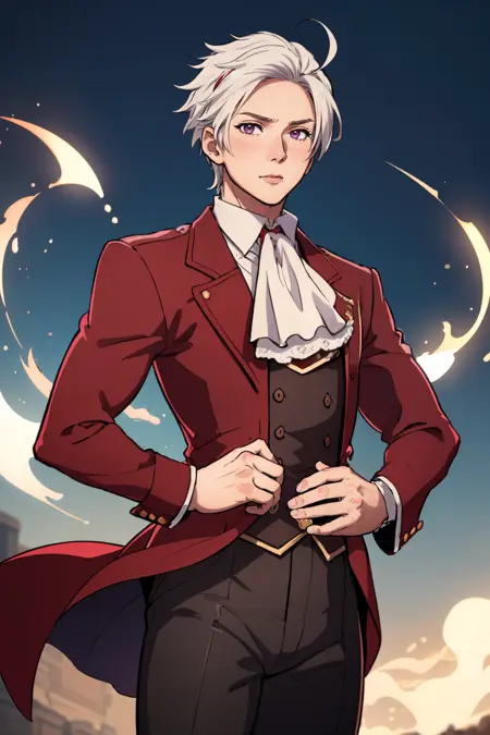 彼のオリジナル衣装には:「ascot, waistcoat, glasses」を使用してください。ただし、そのウエストコートは青か紫のどちらか、明確ではありません。