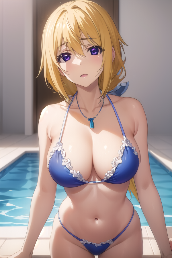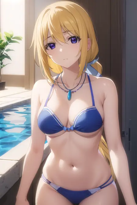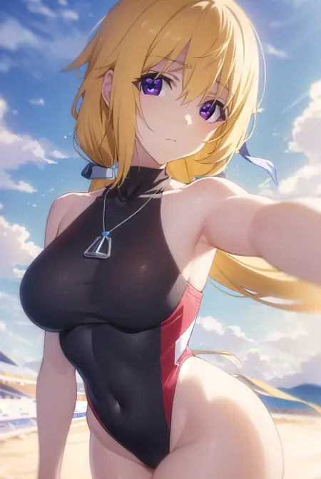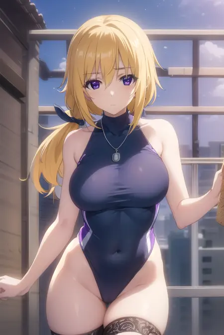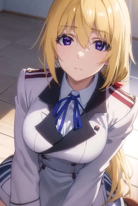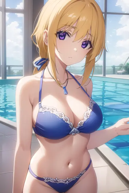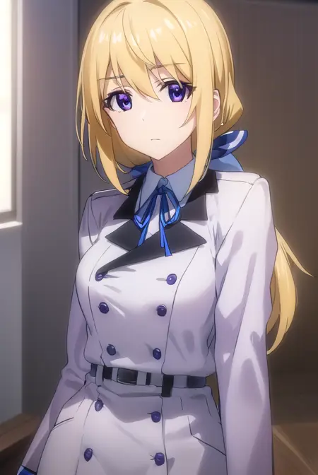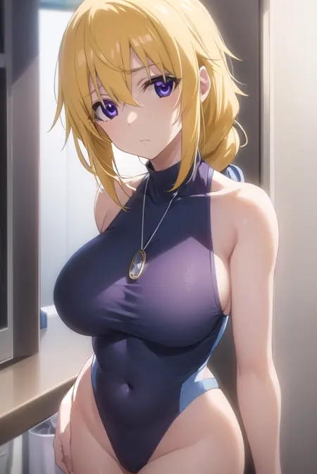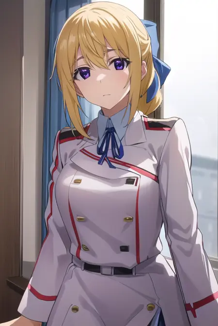 charlotte dunois, long hair, blonde hair, ribbon, (purple eyes:1.1), ponytail, hair ribbon,