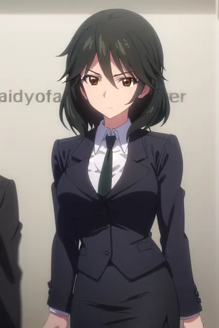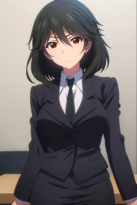 skirt, shirt, long sleeves, jacket, white shirt, necktie, black skirt, black jacket, formal, suit, black necktie, pencil skirt, skirt suit,