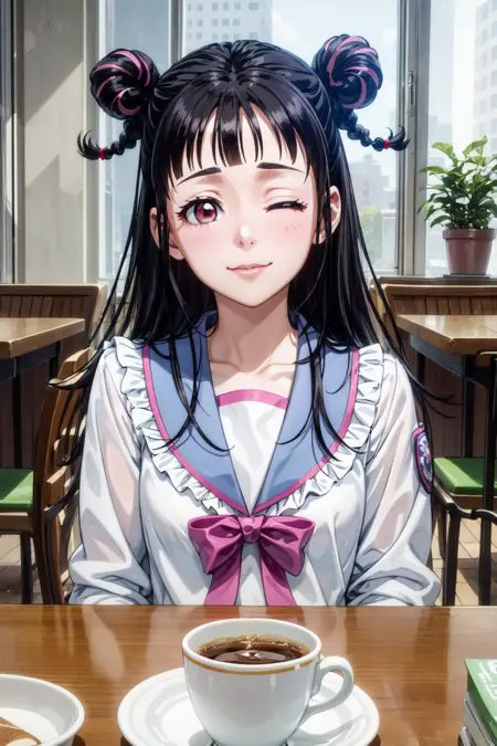 mahoro, 1girl, black hair, double bun, bangs, long hair, braid, pink eyes, two-tone hair, heart hair ornament