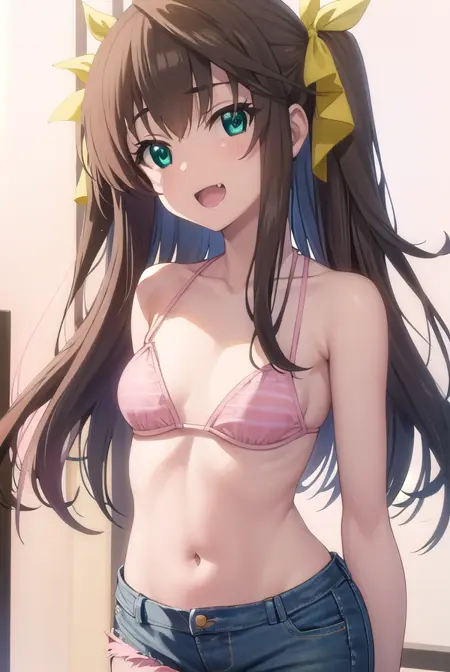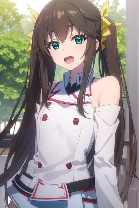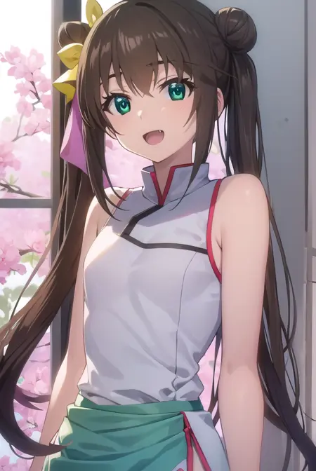 lingyin huang、長い髪、茶色の髪、リボン、ツインテール、(緑の目:1.3)、髪リボン、牙、
