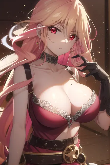 gloves, dress, cleavage, jewelry, choker, black gloves, belt, breasts apart, center opening, red dress,