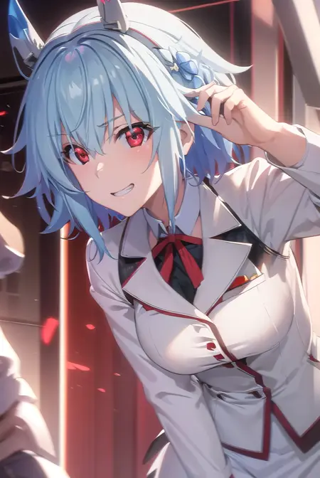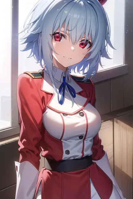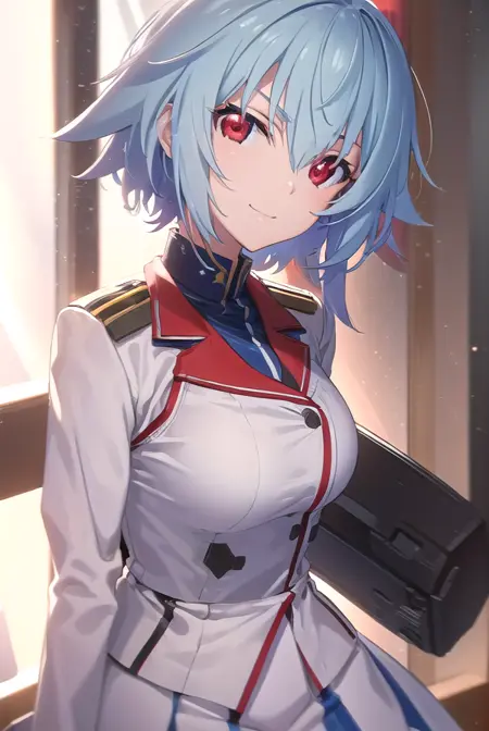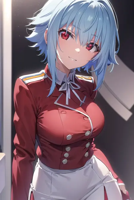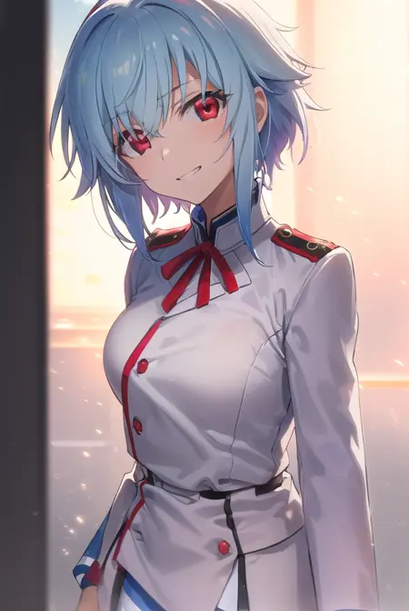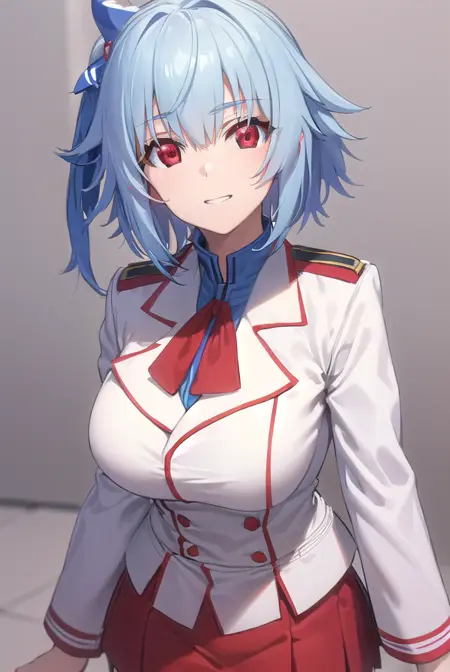 school uniform, ribbon, blue ribbon, long sleeves, (red trim:1.2), uniform, military uniform, (white military uniform:1.5),