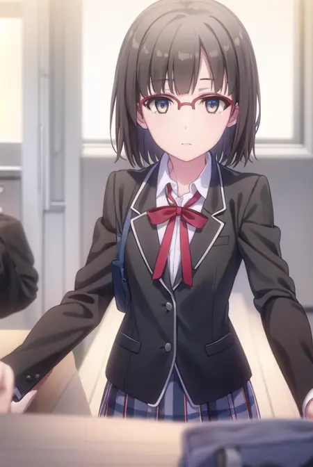 hina ebina, short hair, brown hair, black hair, (brown eyes:1.3), glasses,