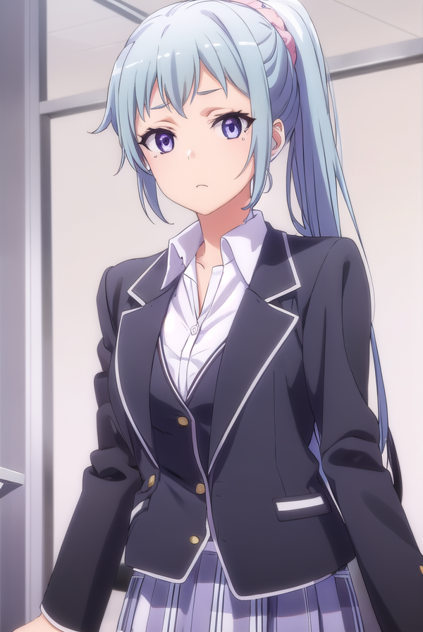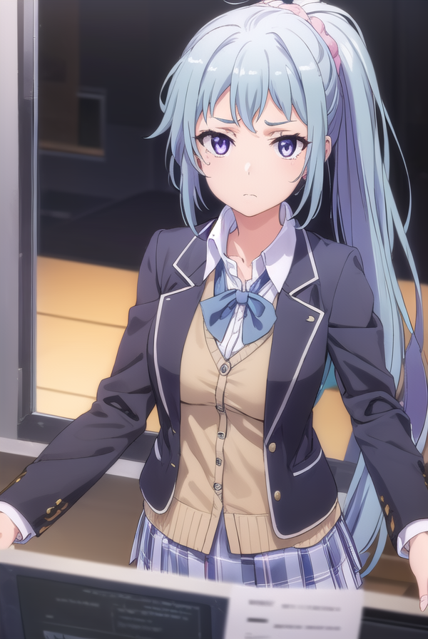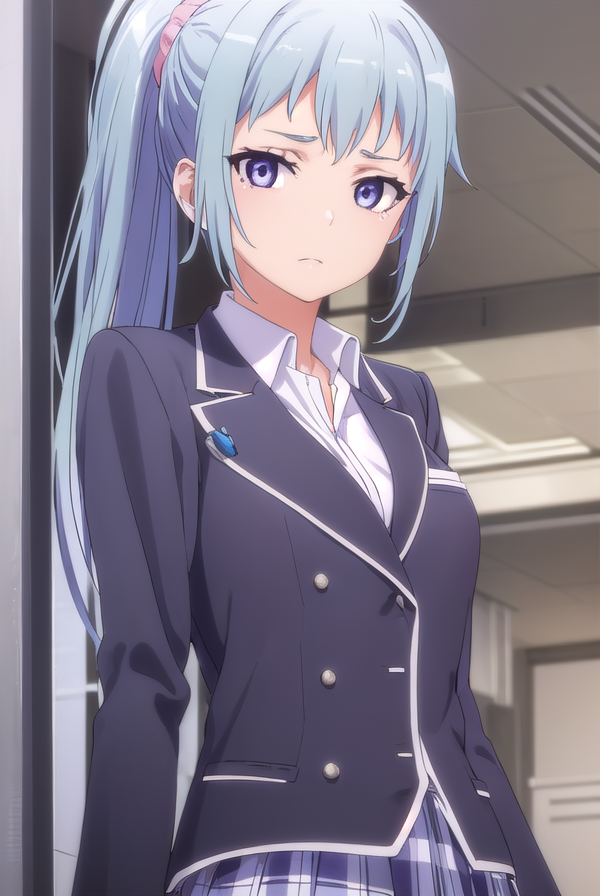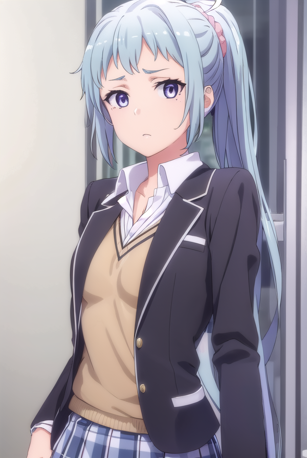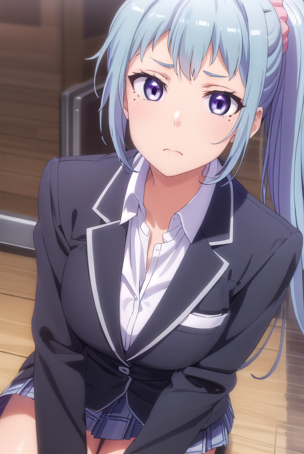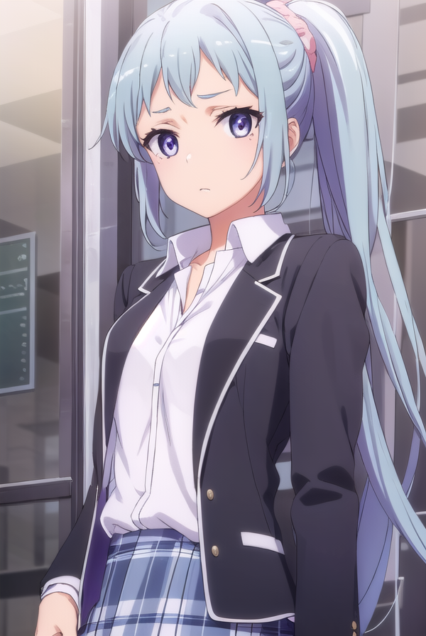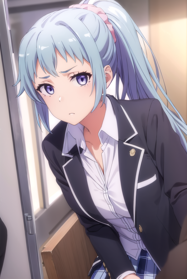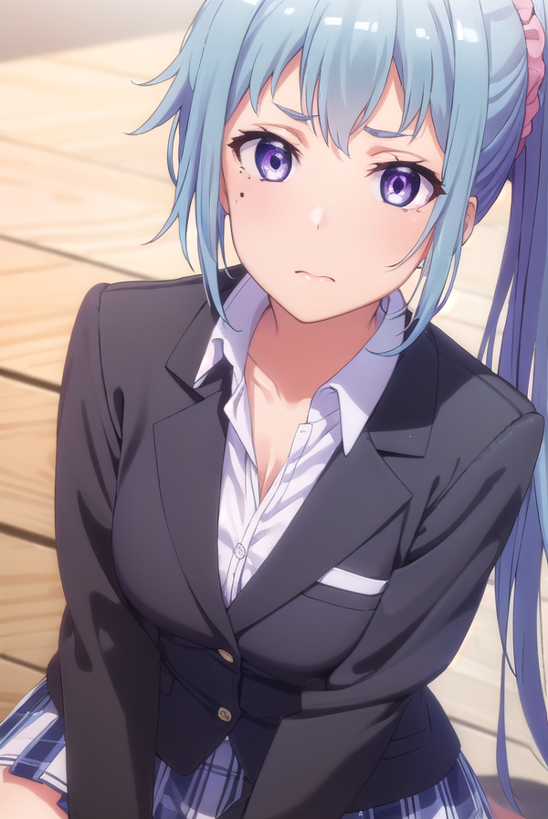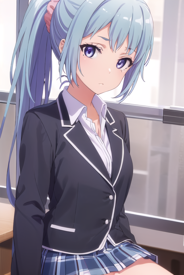 saki kawasaki, long hair, hair ornament, blue hair, (purple eyes:1.1), ponytail, mole, mole under eye, scrunchie, hair scrunchie, pink scrunchie,