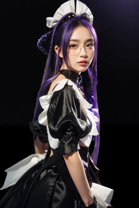 adb_maid, 1girl, solo, long hair, purple hair, braid, bangs, blunt bangs, hat, ribbon, hair ribbon, (purple eyes:1.4), closed mouth, lips, gloves, dress, black dressr, breasts, large breasts, maid, maid headdress, apron, maid apron, star (symbol), bow, short sleeves, black gloves, puffy sleeves, black footwear, high heels, simple background, realistic, black bow, tray