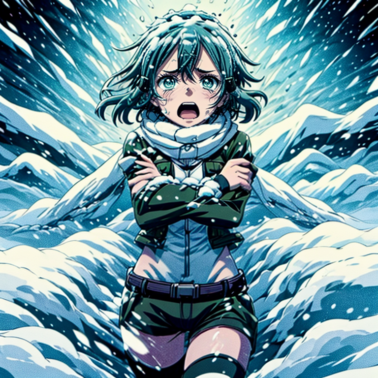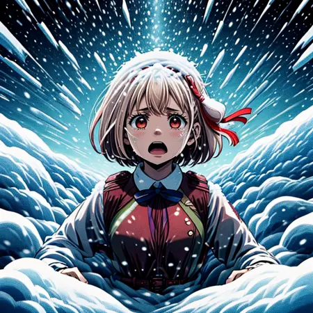 In this type of LoRa imagery, if the prompt includes clothing, the generated image will show the clothing prominently. So, if you want to create a scene where the entire body is submerged in snow, it's better to omit clothing from the prompt. A strength of 0.4 works well, but if you want to achieve a more convincing effect of being submerged in snow, setting the strength to around 0.6 could be more effective.
