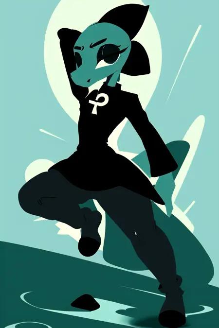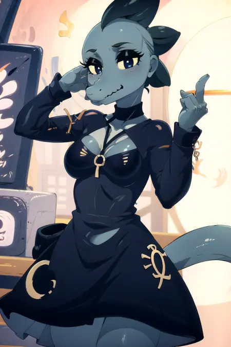 태그 "bea santello, furry"를 사용하세요. 옷차림에 따라 검정 셔츠, 검정 드레스, 십자형 목걸이, 노란 눈백, 등을 추가로 활용할 수 있습니다.