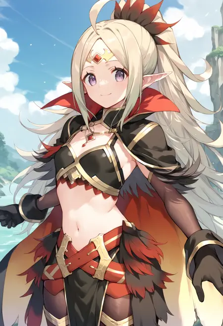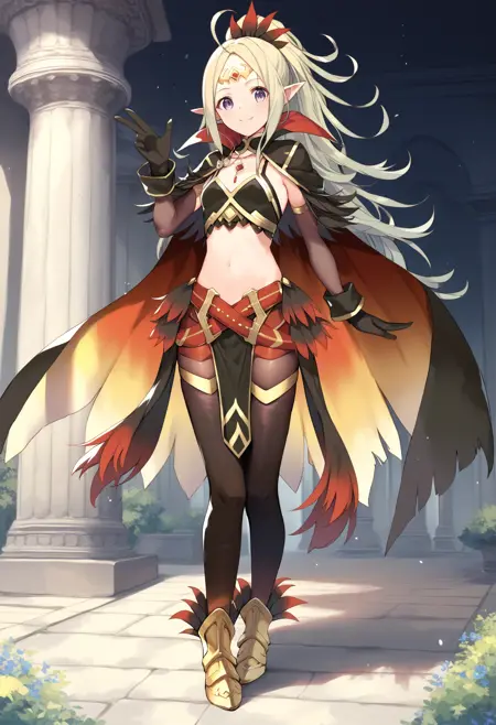 Add "tiara,circlet,cape,black gloves,elbow gloves,jewelry,black bra,navel,multiple belts,pelvic curtain,pantyhose,armored boots" for her resplendent look.(resplendent_AnimagineXL,resplendent_SD1.5)