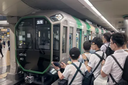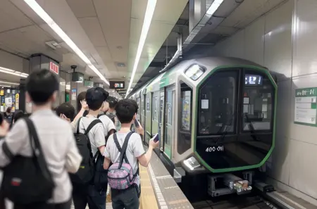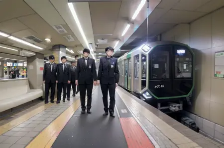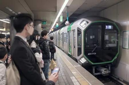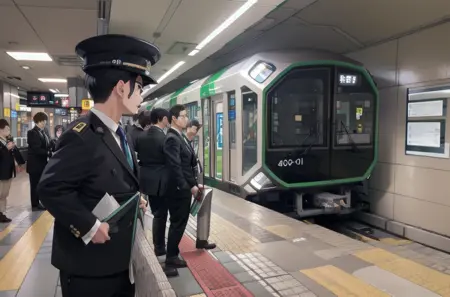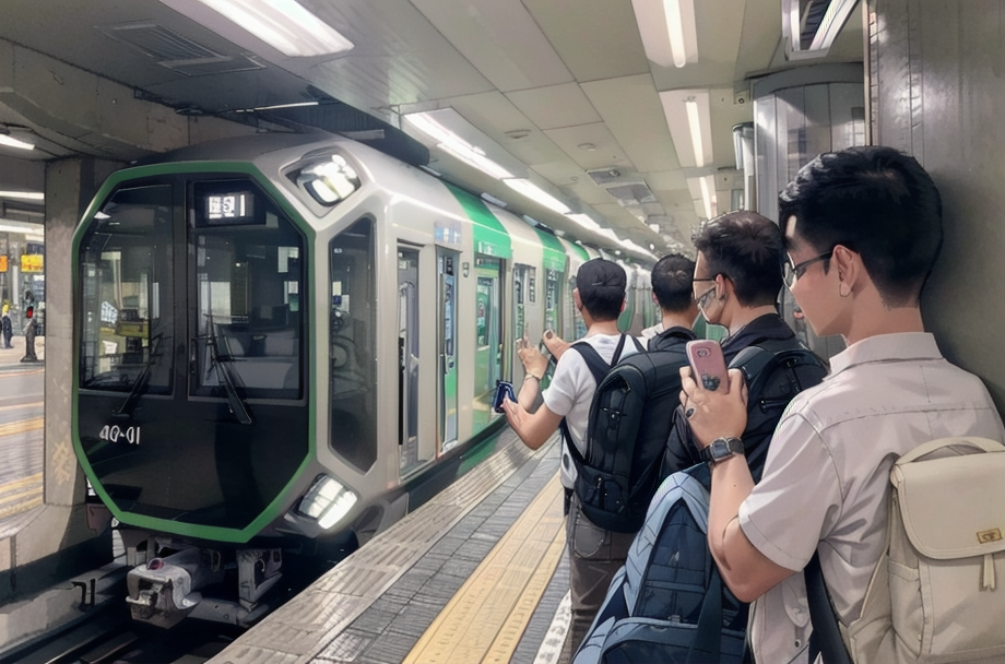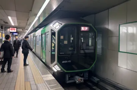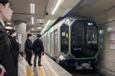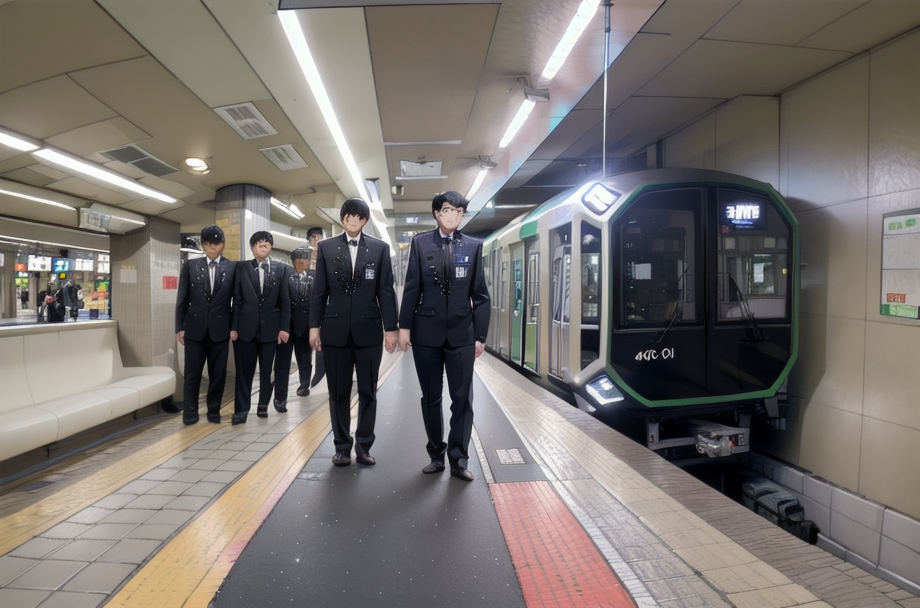 Prompt: OsakaMetro400, subway station, train station, train, scenery, railroad tracks