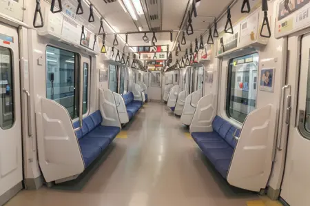 Prompt: e233, train interior, scenery, seat, poster (object),
