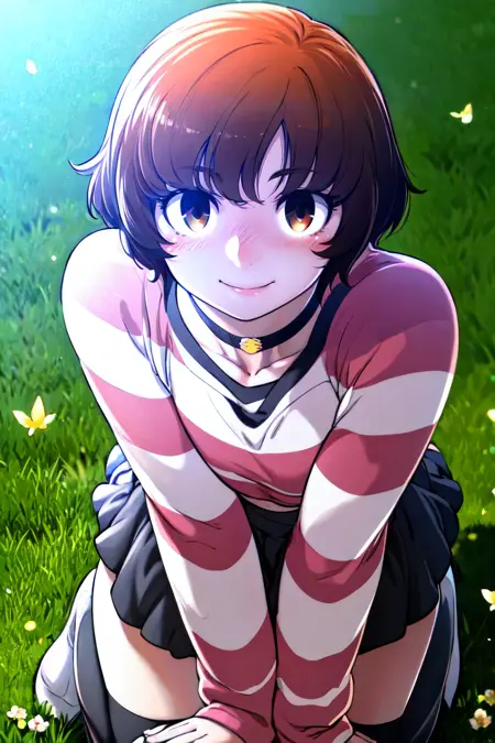 • Trigger : 1girl, short hair, choker, thighhighs, skirt, striped shirt