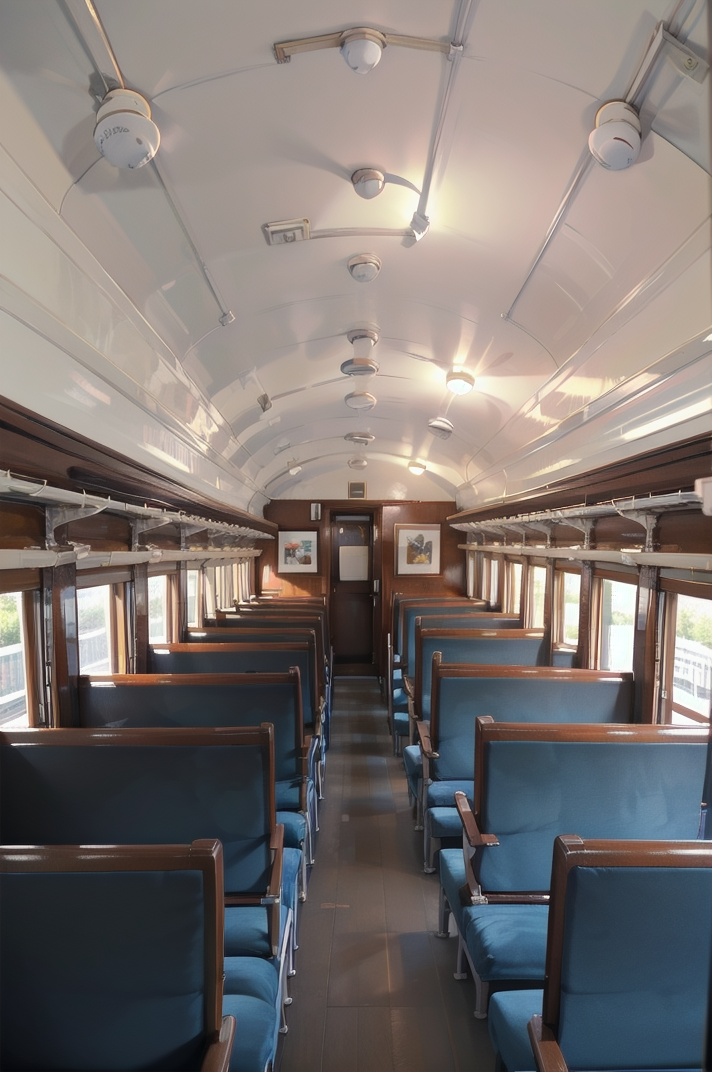 Prompt: oha35, train interior, scenery, chair, sunlight, window, indoors, seat, wooden floor, ceiling, ceiling light,