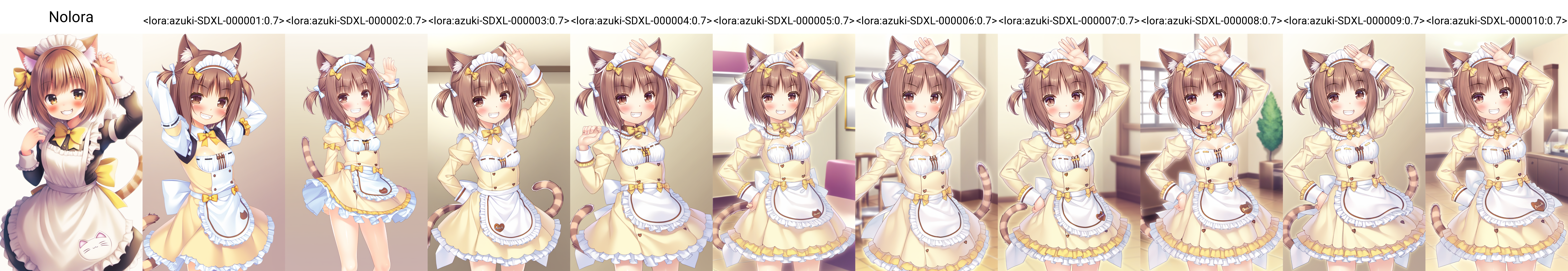 training was conducted using approximately 800 images, consisting of 70% official images, 20% high-quality AI images, and 10% fan-made images. The training utilized the animagineXLV3_v30, noting some overfitting issues with versions after 002. The training resolution was set at 1024*1024, and it was conducted on an A40 graphics card for 14 hours, though it ended in failure (sadly...). The trigger keyword used was nekopara__azuki, and the rest of the trigger words are the same as those released in my 1.5 version of azuki lora. The training dataset for sdxl is essentially an enhanced version of the 1.5 dataset, with super-resolution and other techniques used to add more images.