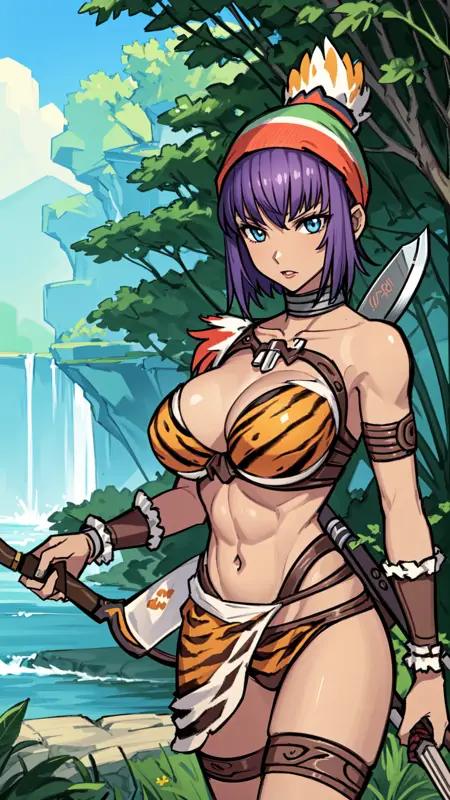 1woman, tanned skin, tribal headdress, tucked away violet hair, blue eyes, metal collar, tigerprint bikini, leopardprint skirt, bracelets, feathers accessories, navel, gladiator shoes,