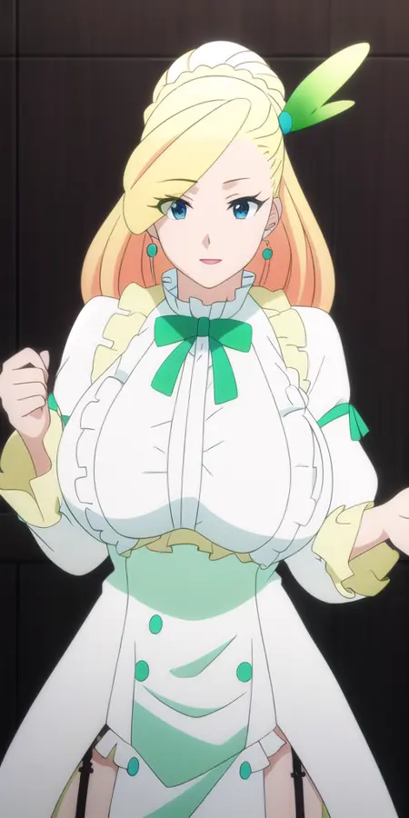 White_frilled_dress_Black_thighhighs_Garter_straps_Green_bowtie_Feather_hair_ornament: Her white dress when she is going to have an engagement ceremony.