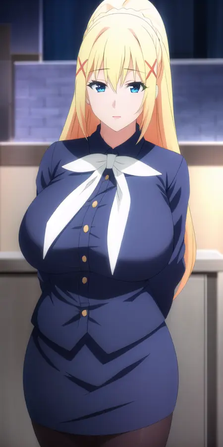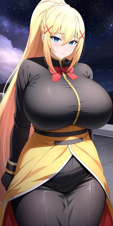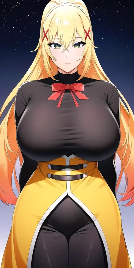 Black_bodysuit_Yellow_high-waist_skirt_Front_slit_Red_bowtie: Her normal outfit with her breastplate removed.