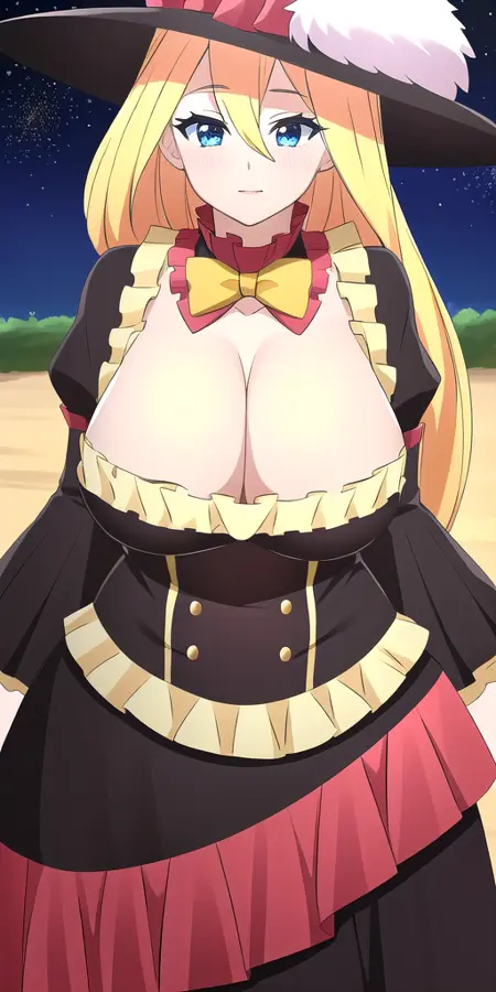 Black_dress_Red_skirt_Frills_Yellow_bow_Black_hat_Low_neckline_Cleavage: Her other dress the dark one with red skirt and a hat. I don't remember exactly when it is from(maybe the capital?).