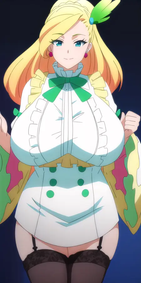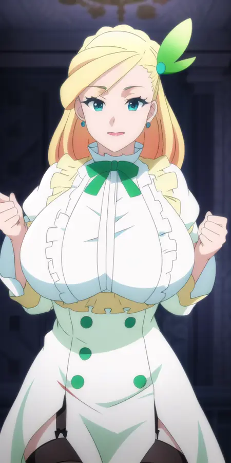 White_frilled_dress_Black_thighhighs_Garter_straps_Green_bowtie_Feather_hair_ornament: Her white dress when she is going to have an engagement ceremony.