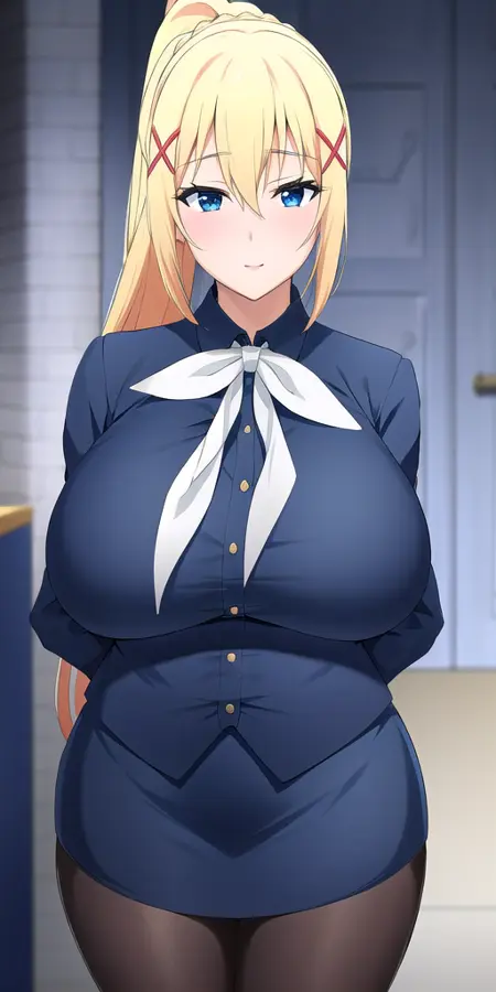 Blue_skirt_suit_white_neckerchief_Black_pantyhose_Pencil_skirt_Miniskirt: A blue pencil skirt office lady outfit she uses one time.