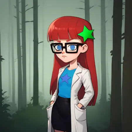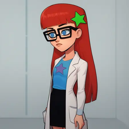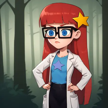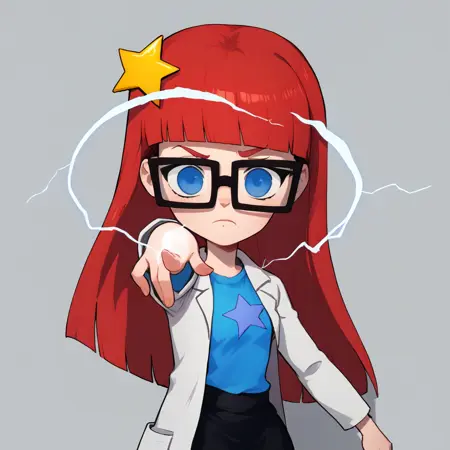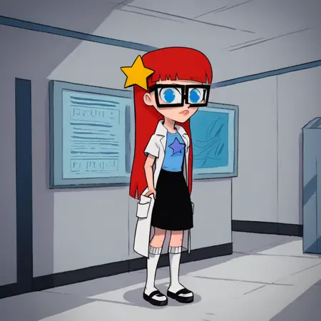 solo, 1girl, Susan, Red hair, long hair, blunt bangs , blue eyes, glasses, black skirt , blue t-shirt, star hair ornament, lab coat , long sleeves,