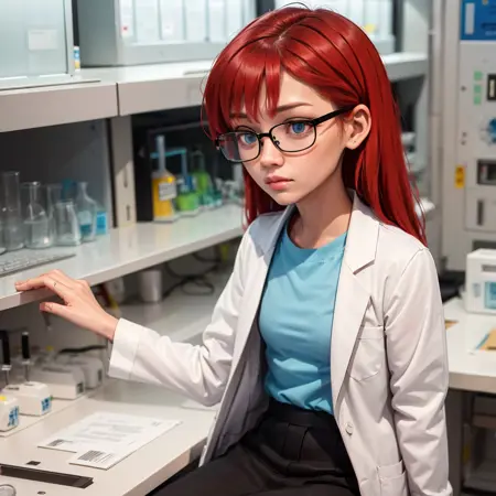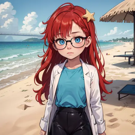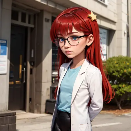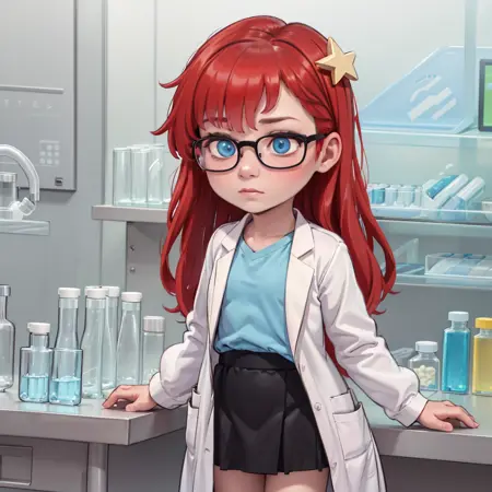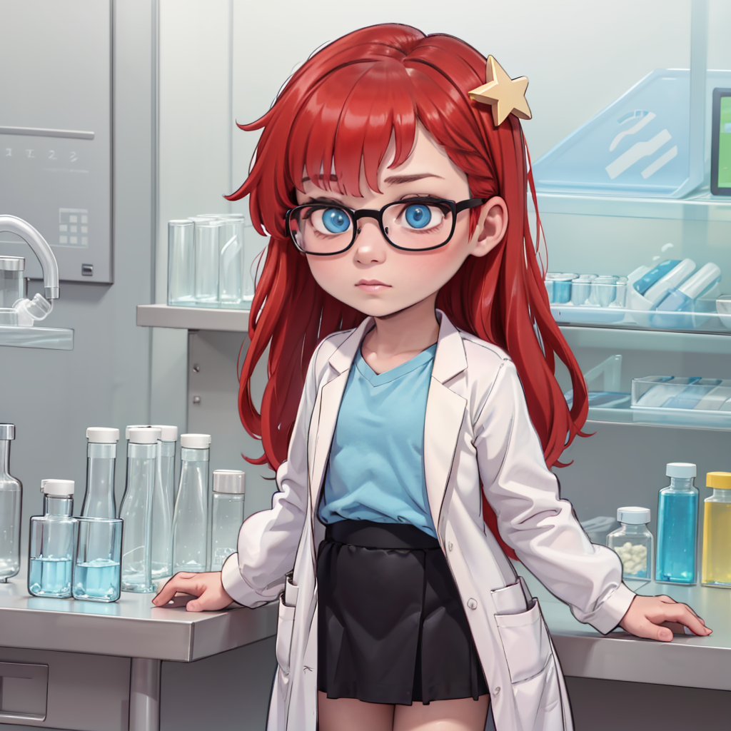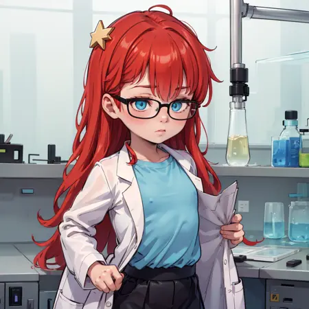 1girl, Susan test, glasses, long hair, red hair, labcoat, black skirt, blue eyes, star hair ornament ,hair ornament, blue shirt, open clothes