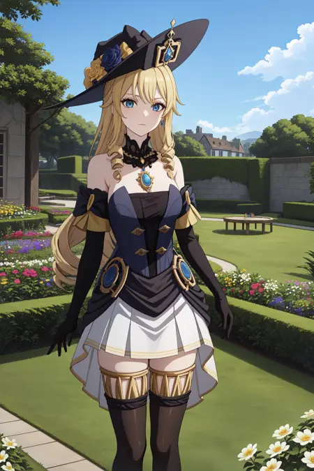 navia, long hair, blonde hair, hat, blue eyes, dress, bangs, black headwear, gloves, bare shoulders, flower, jewelry, thighhighs, black gloves, drill hair, detached sleeves, witch hat