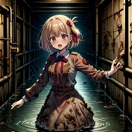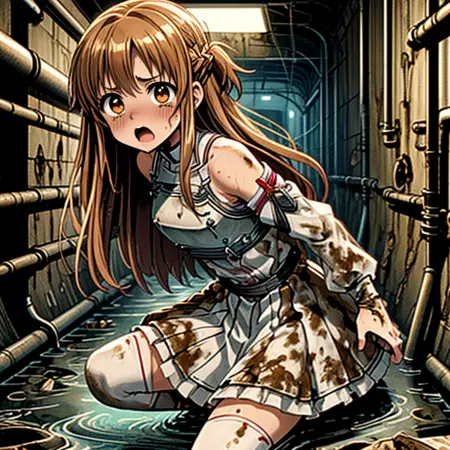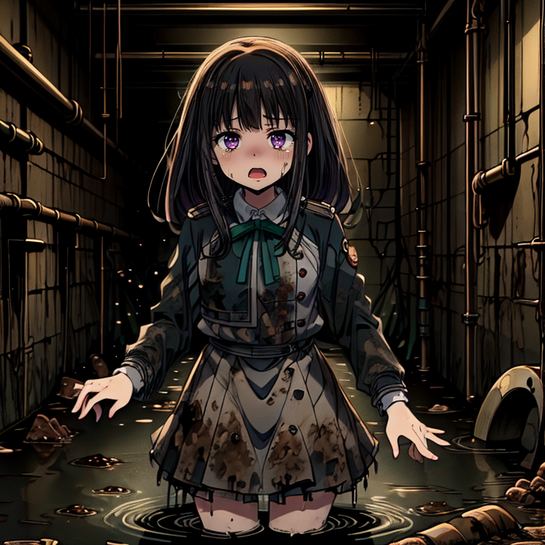 I created a Lora that walks in the sewer. It's known that sewers can be depicted in Stable Diffusion, so I made one where a specific character walks through it. The depiction mainly focuses on walking through the sewage, with the character's clothes and face getting muddy. From testing, a strength of 0.4 works, but 0.6 makes it even dirtier.