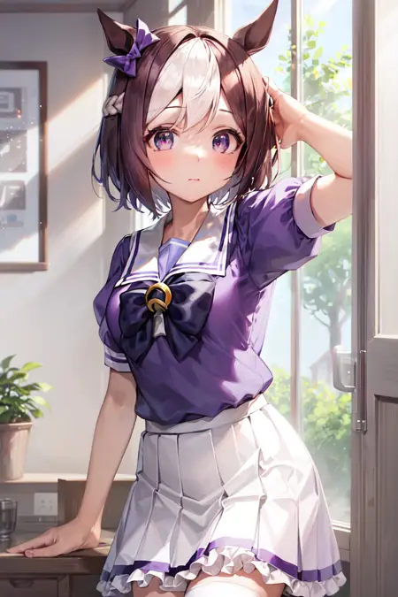 - 트레이컨 학교 복장, 여름 복장, 세라푸쿠, 볼륨감 있는 짧은 소매, 보라색 넥타이, 말굽 장식, 선장 학교 칼라, 선장 셔츠, 보라색 셔츠, 하얀 치마, 접힌 치마, 주름, 미니 치마, zettai ryouiki, 하얀 레깅스, 갈색 신발, 로퍼
