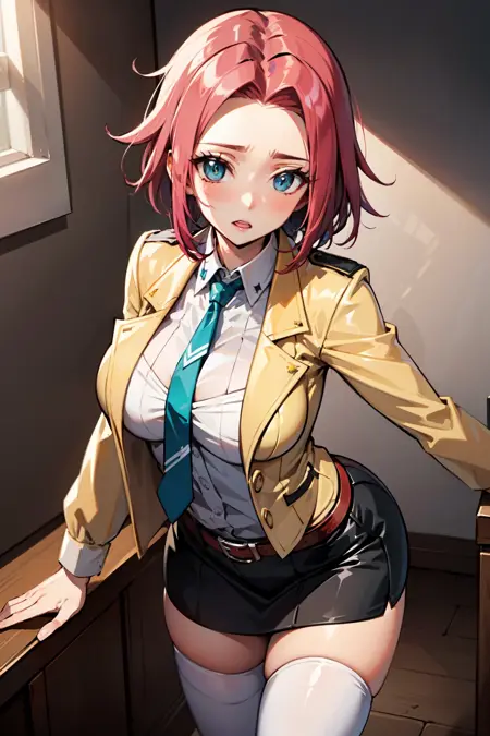 ➜ KallenStadfeld、青い目、ピンクの髪、立ち上がった髪、髪の毛流れ、シャツ、(黄色のジャケット:1.2)、(黒いミニスカート:1.2)、(緑のネクタイ:1.4)、ベルト、(白いシャツ:1.2)、(白い太ももハイ:1.3)、絶対領域