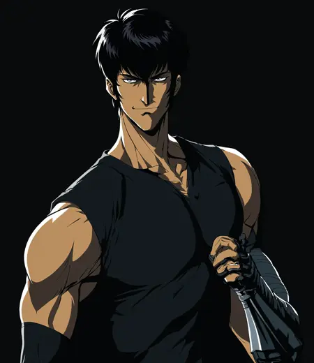 Genma - (black hair, short hair, straight hair, long sideburns, pixie cut, bangs, eyelashes, black eyes, manly, muscular, pectorals, thick arms (possibly), glaring, chin, serious., smile, smirk, dark skin.