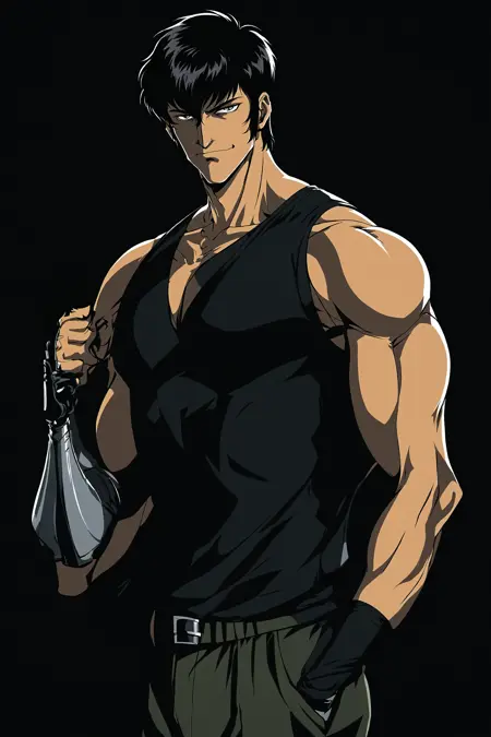 幻魔 - (黑发,短发,直发,长鬓角,精灵短发,刘海,睫毛,黑眼,阳刚,肌肉发达,胸肌,粗壮手臂(可能),怒视,下巴,严肃,微笑,冷笑,深色皮肤。