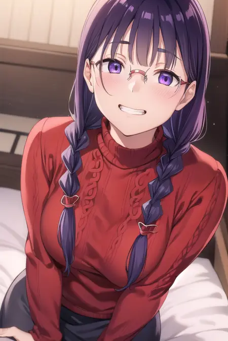 miyoshi,长发,刘海,(紫色眼睛:1.1),紫色头发,辫子,眼镜,双辫,