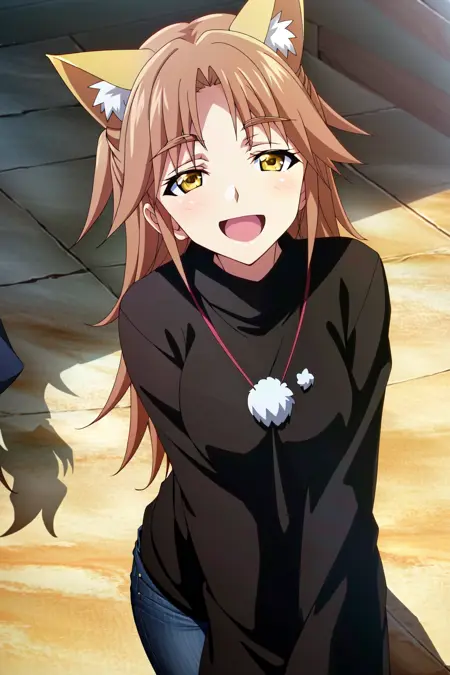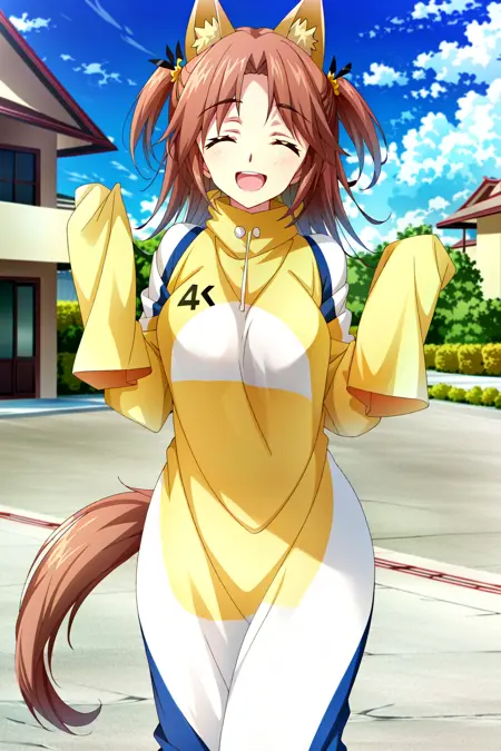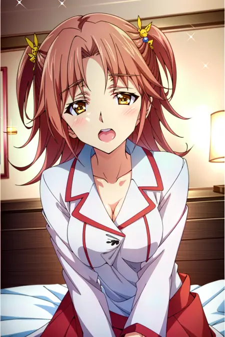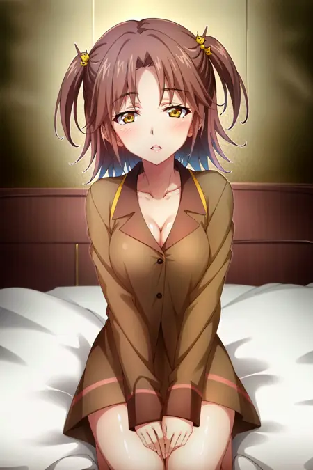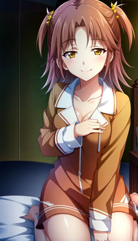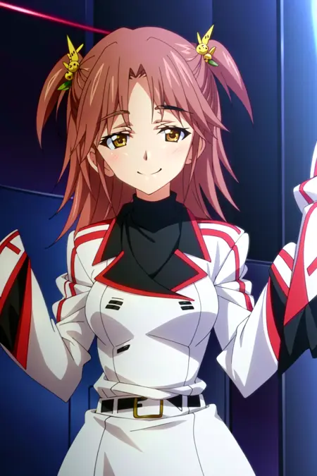 Honne Nohotoke, 1girl, solo, brown hair, smile, school uniform, yellow eyes, two side up, long hair, hair ornament, twintails