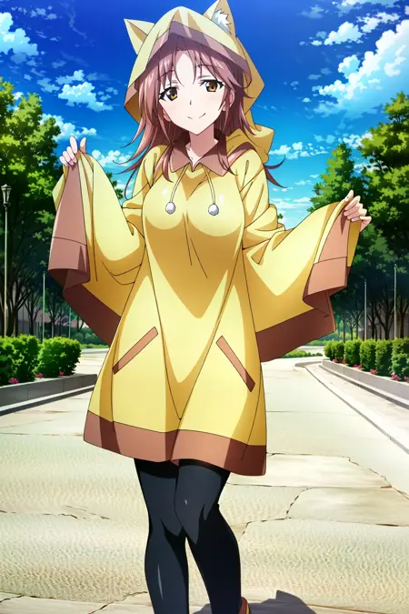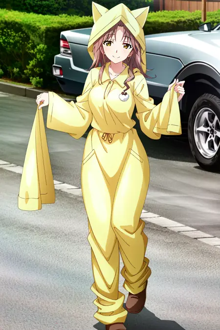 Honne Nohotoke, 1girl, solo, smile, pajamas, brown hair, looking at viewer, standing, hood, animal hood, animal ears