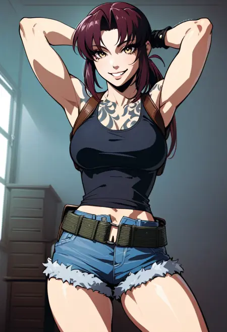 デフォルトの服装: タンクトップ, 指なし手袋, デニムショーツ, ベルト, ホルスター