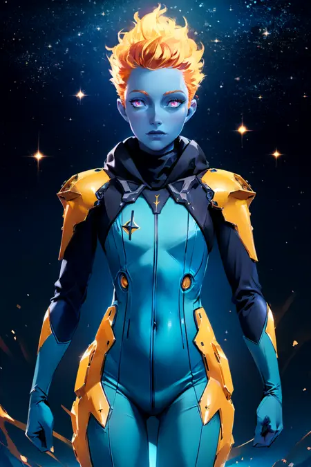 대체 형상 프롬프트: nikkigotg, 파란 피부, 1소녀, 주황색 머리, 불꽃 머리, 대체 복장, 바디수트, 조종복, 어깨 갑옷