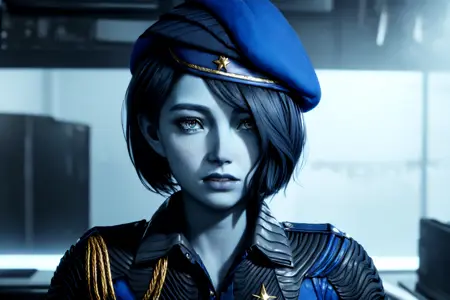 사관 복장 프롬프트: nikkigotg, 파란 피부, 검은 머리, 1소녀, 베레모, 단발, 모자, 파란 머리 장식, 복장, 경찰 복장