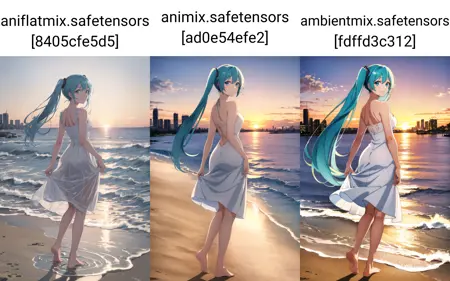 最後のサンプル画像では、私の3つのミックスモデルであるAniflatmix、Animix、Ambientmix(このモデル)の比較を示しています。