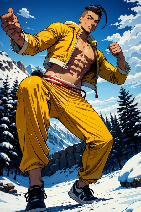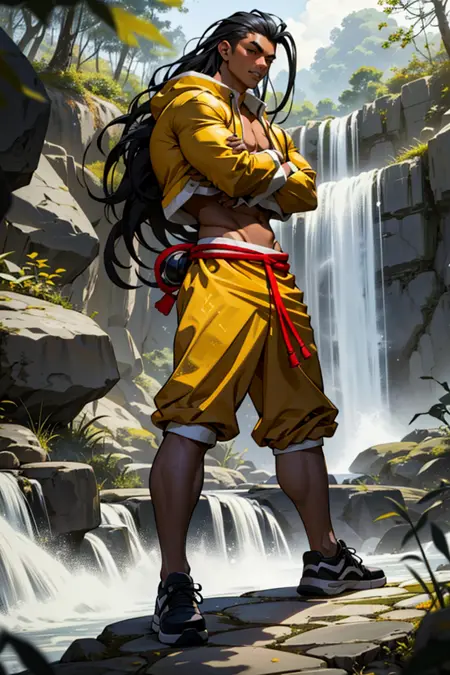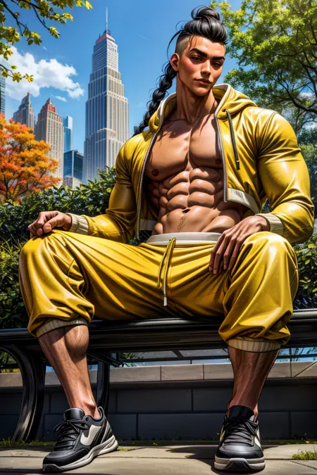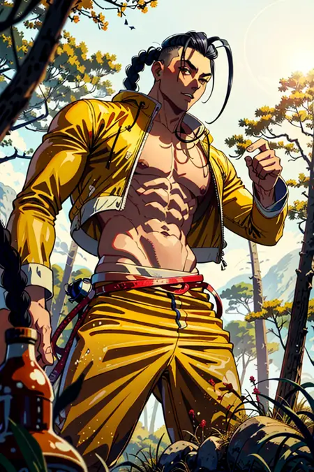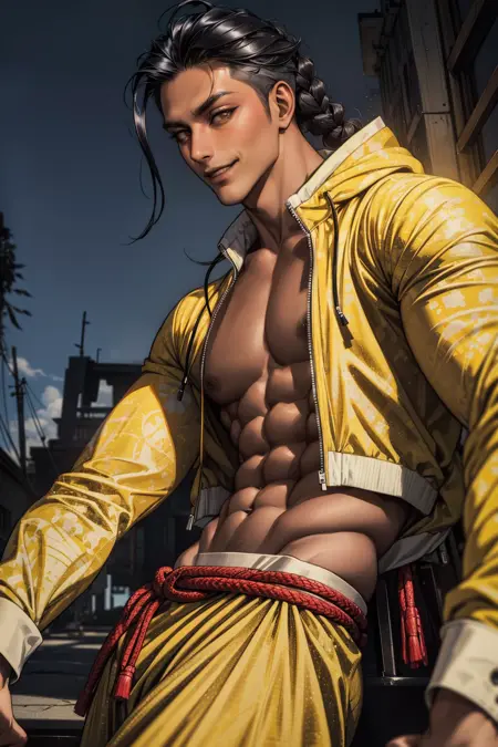 また:片方の編み込みまたは髪を下ろした状態、イエローのジャケット、(レッド)ベルト、イエローのパンツ、スニーカー、長い髪、アホ毛