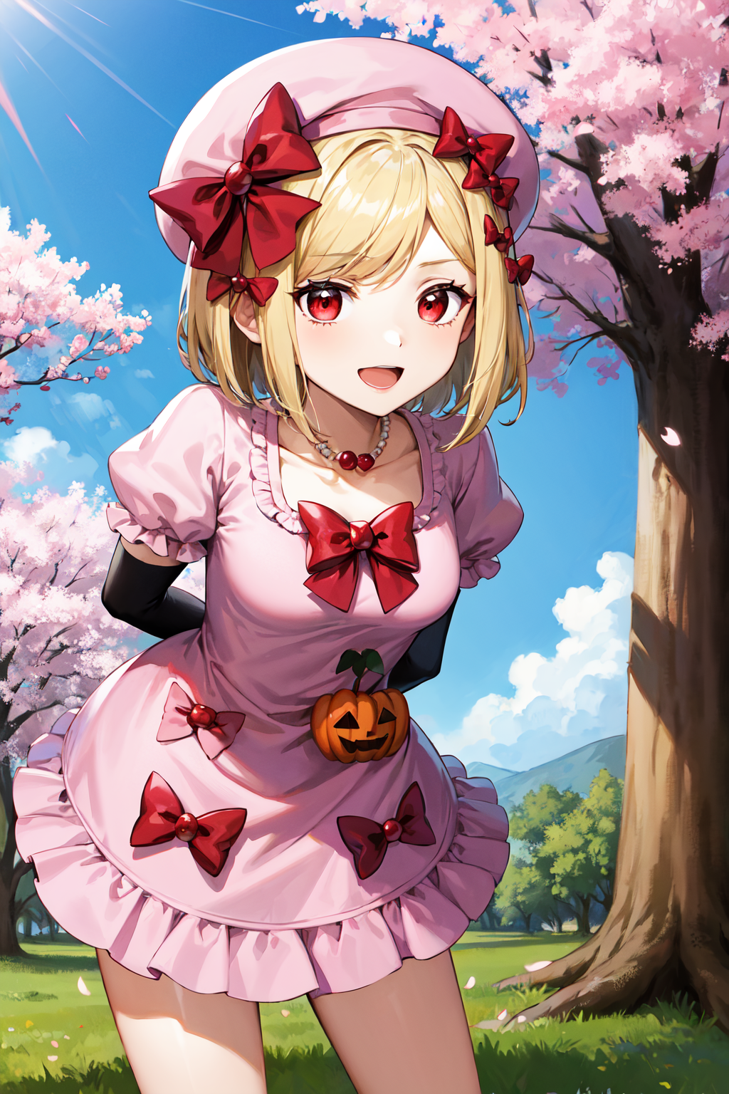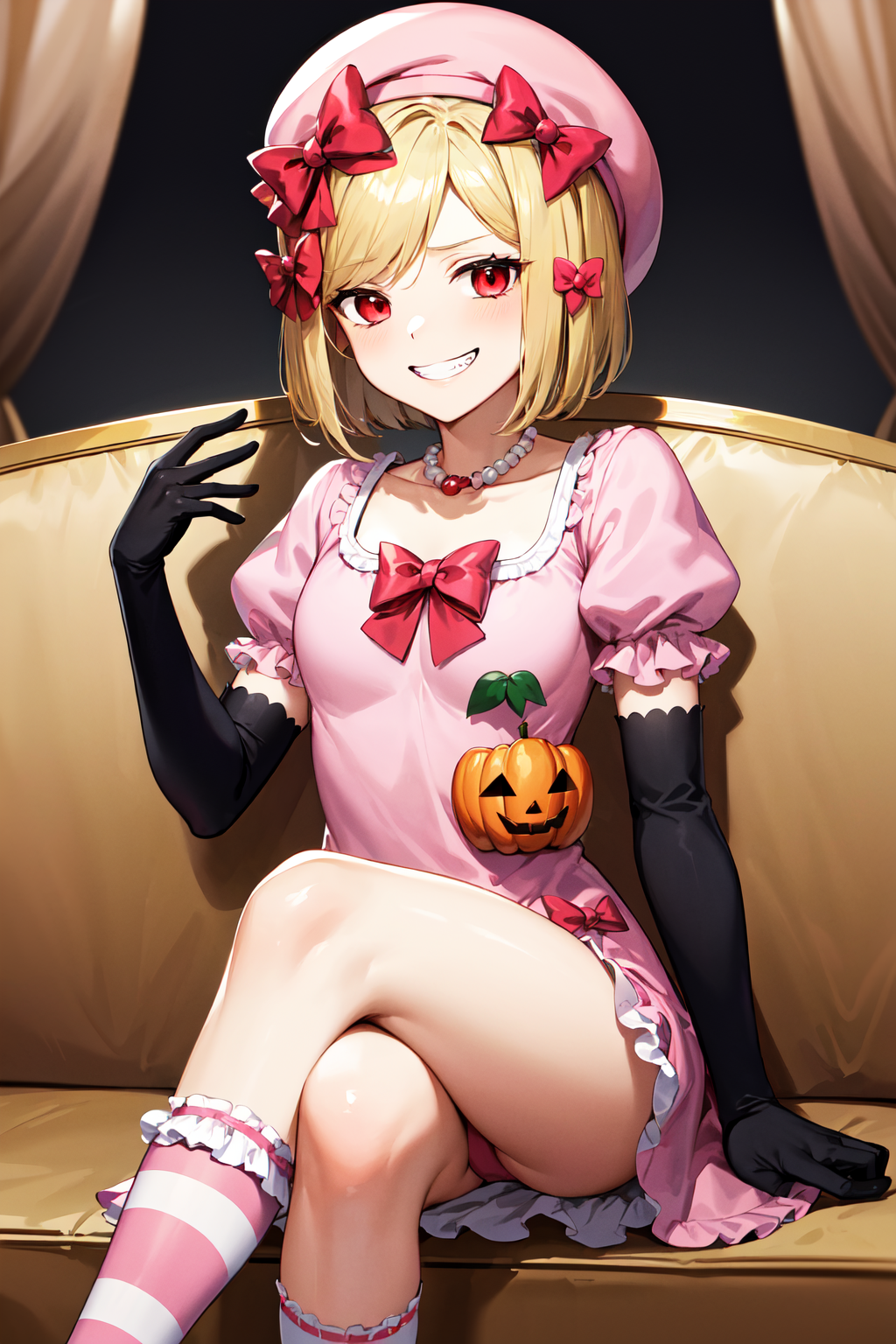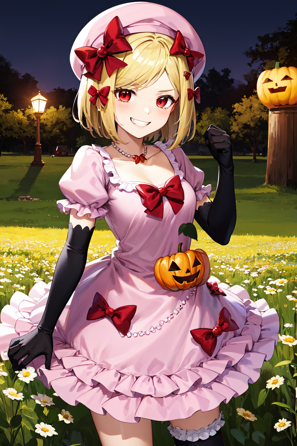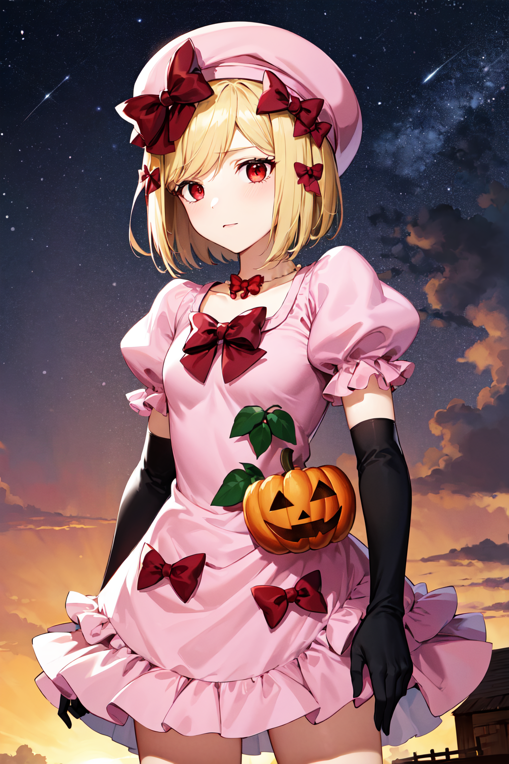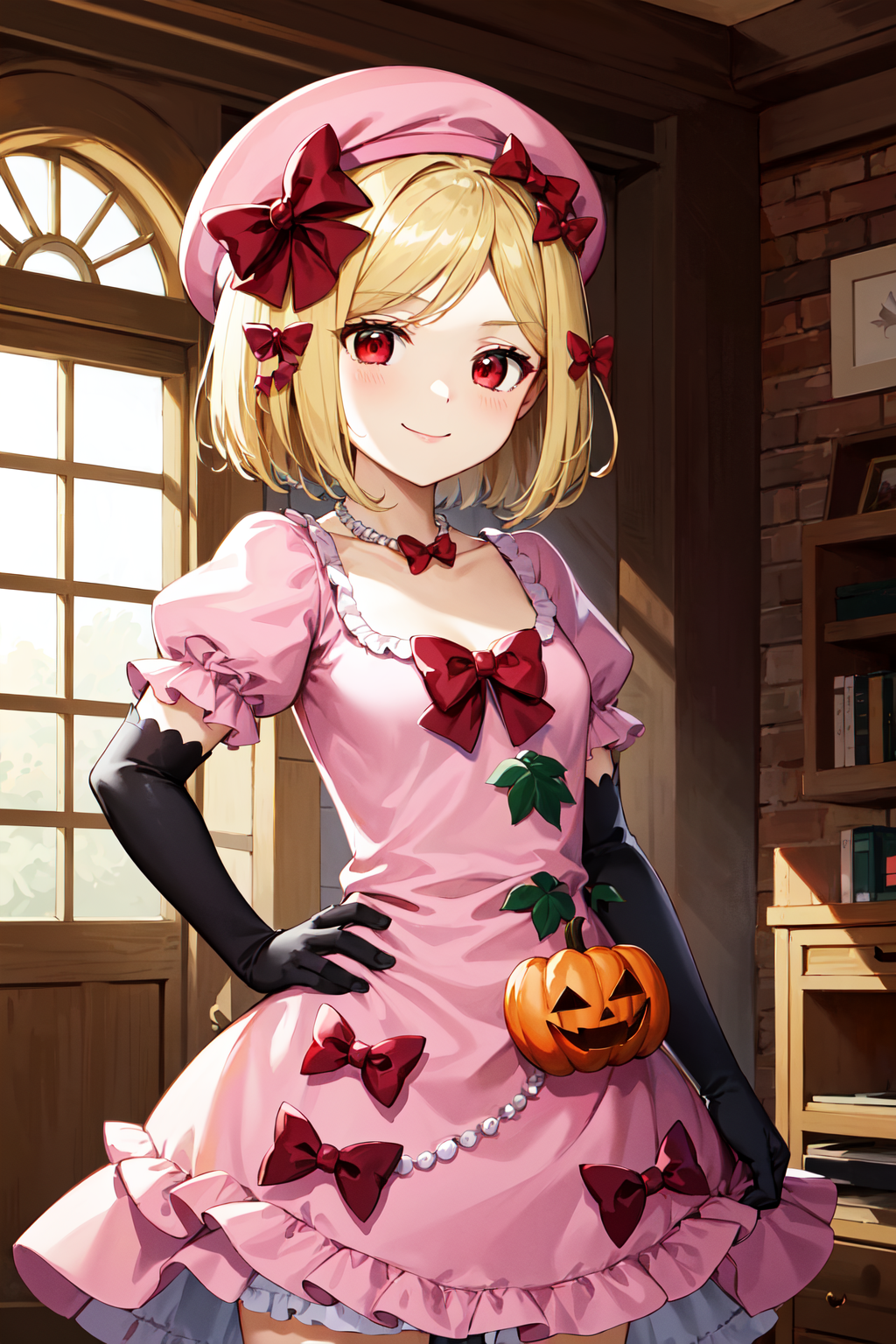 outfit1aalamb, short hair, hair bow, red bow, beret, pink headwear, red eyes, necklace, frills, pink dress, jack-o'-lantern, puffy sleeves, elbow gloves, black gloves