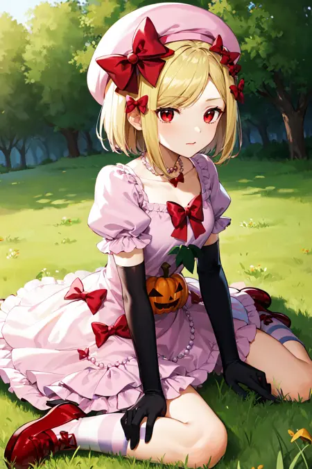 衣装1aalamb, short hair, hair bow, red bow, beret, pink headwear, red eyes, necklace, frills, pink dress, jack-o'-lantern, puffy sleeves, elbow gloves, black gloves