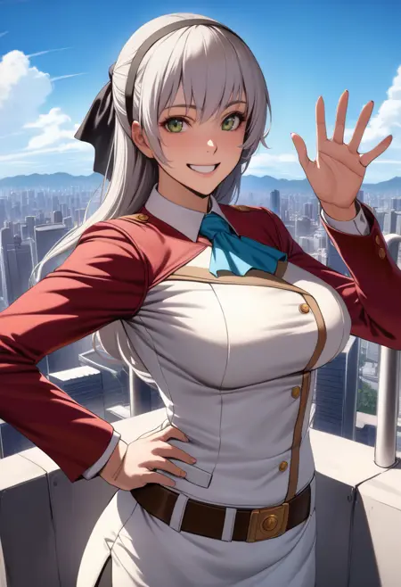 彼女の典型的な外見には、「黒いヘアバンド、ヘアリボン、長い髪、アスコット、制服、長い赤い袖、白いドレス、鉛筆スカート、ベルト、パンティーストッキング、白いブーツ」を追加してください。