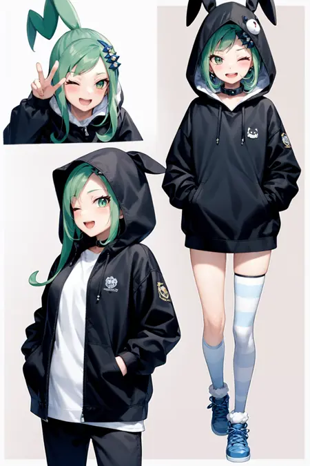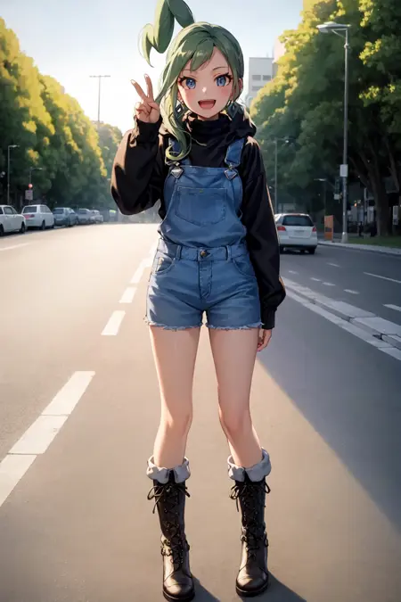 tag:1girl,asymmetrical hair,green hair,sidelocks,ponytail,hair ornament, green eyes, jewelry, earrings,blue choker,fur trim,crop top, arm warmers,navel, white shorts,overskirt, single thighhigh,striped thighhighs,