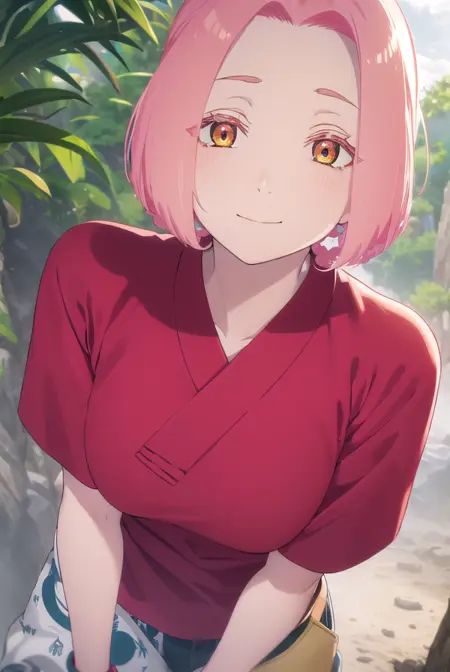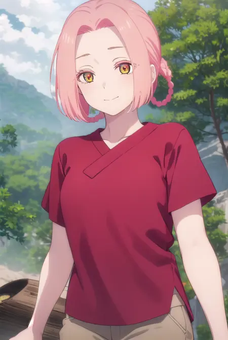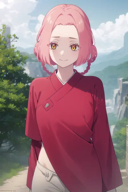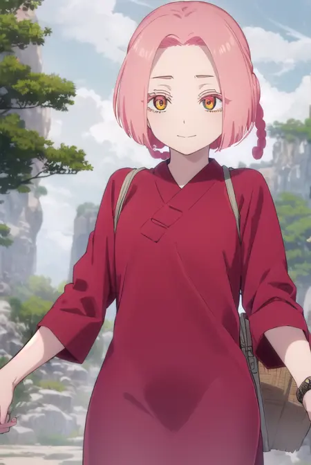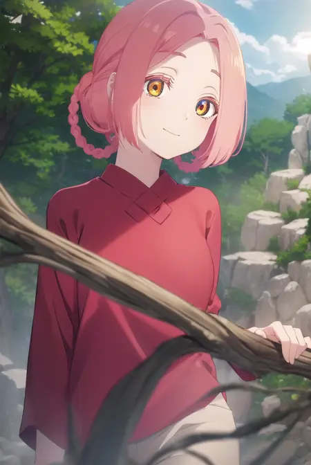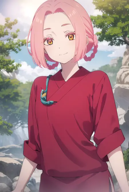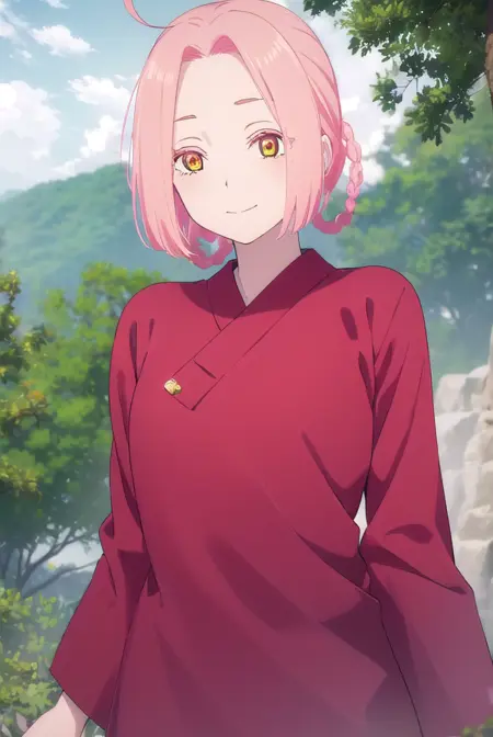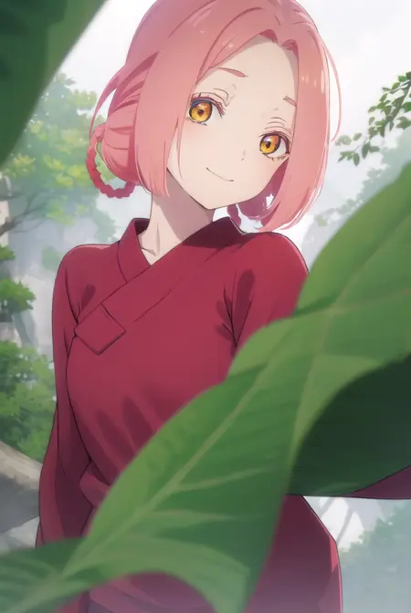 mei, short hair, pink hair, hair rings, (parted bangs:1.5), braid, (yellow eyes:1.3),