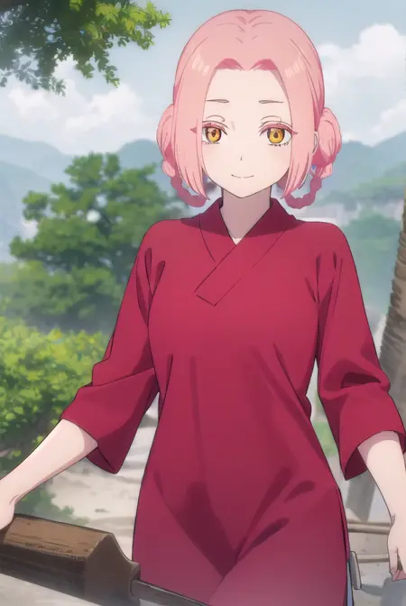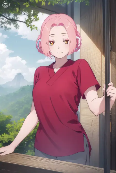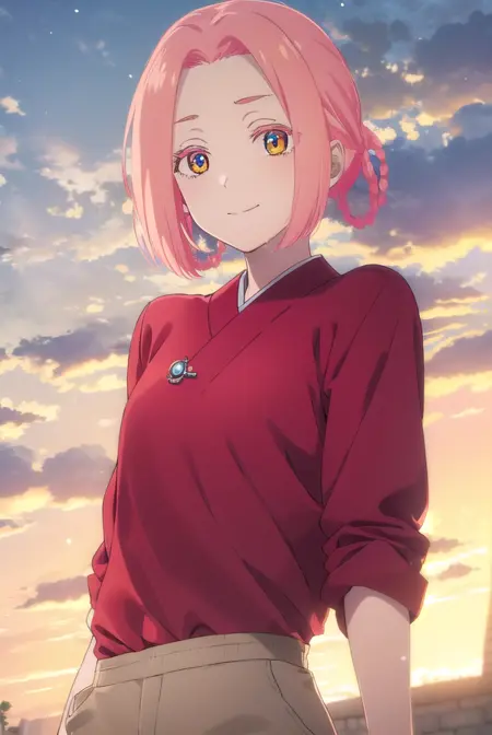 mei,短发,粉发,发圈,(分刘海:1.5),辫子,(黄眼:1.3),