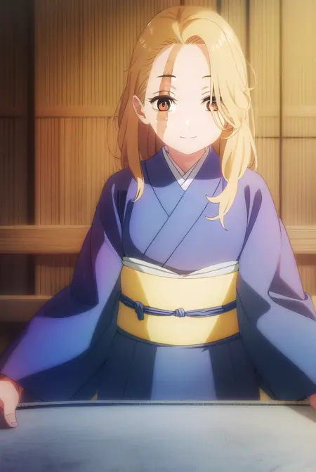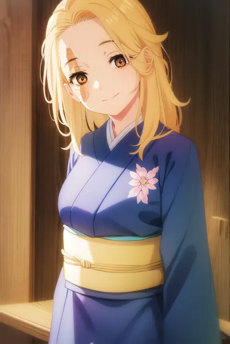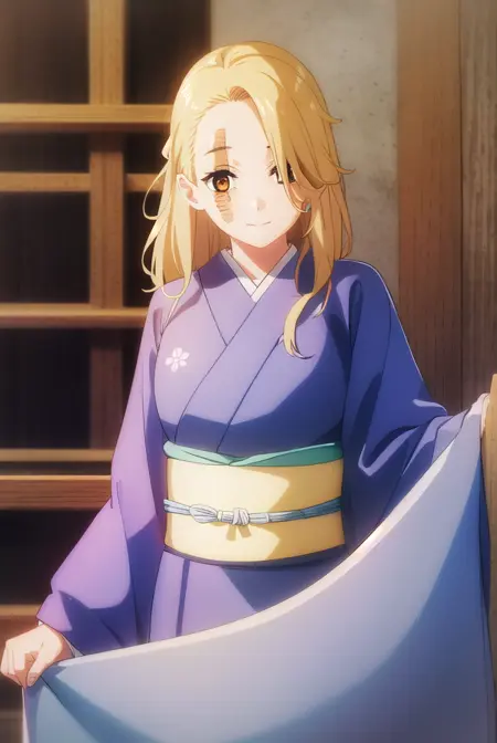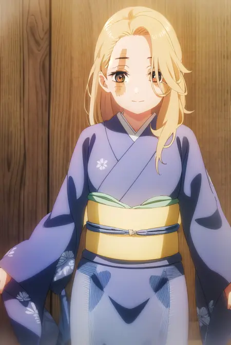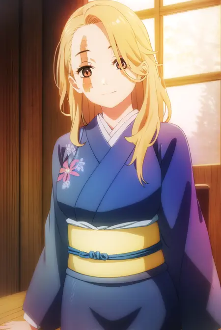 yui, long hair, blonde hair, (brown eyes:1.5), scar, scar on face,