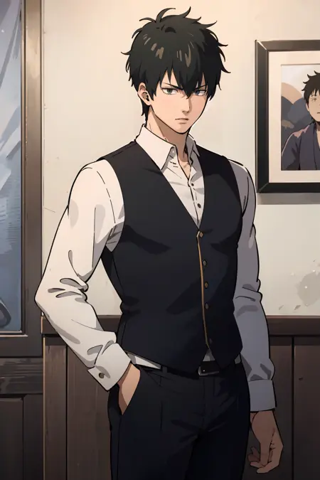 No Jacket Uniform: black vest, white shirt, black pants