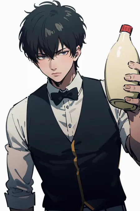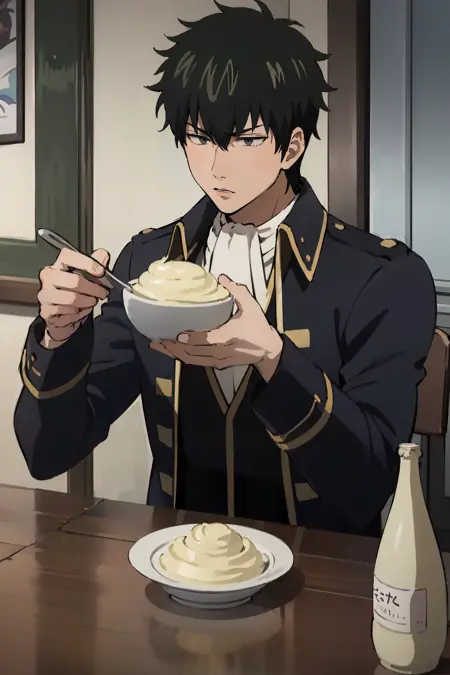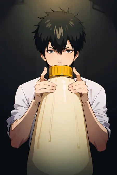 Trained on 419 images (different repeats per category). Different eye color depending on the medium (gray, black, blue, red). Mayonnaise bottle requires some RNG to get a good bottle with a red cap. As always my model supports SFW and NSFW generations.