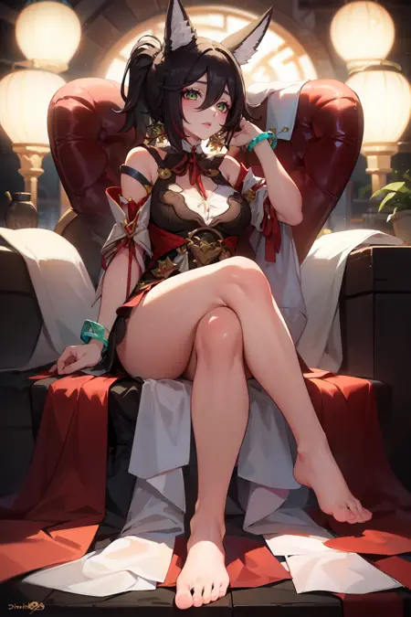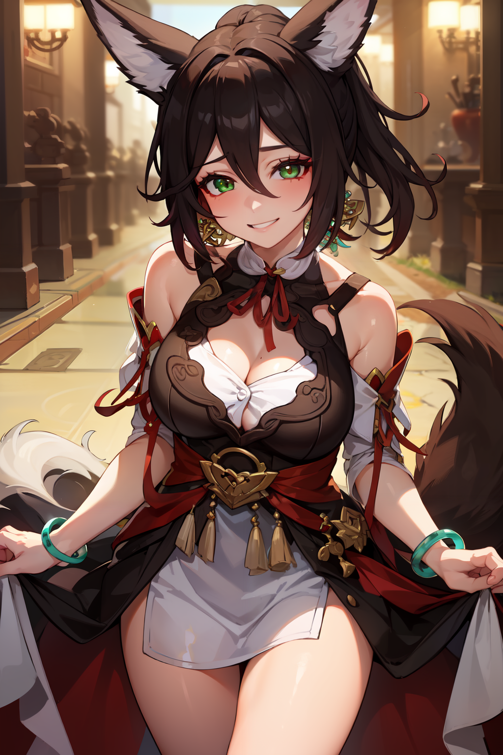 tingyunhsr, green eyes, hair between eyes, ponytail, animal ears, tail,
